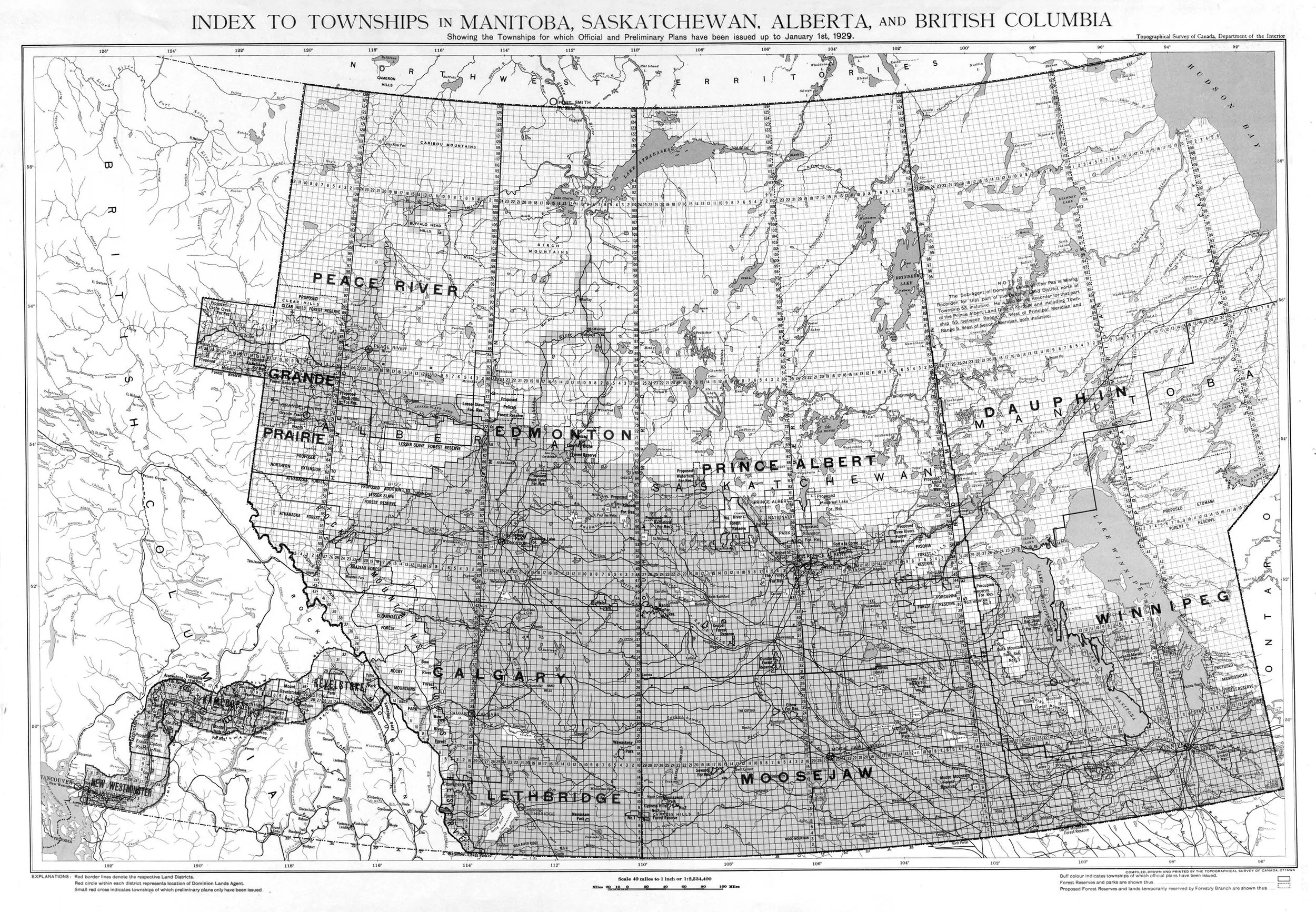 Map showing the townships for which official and preliminary plans were issued up to 1 January 1929.