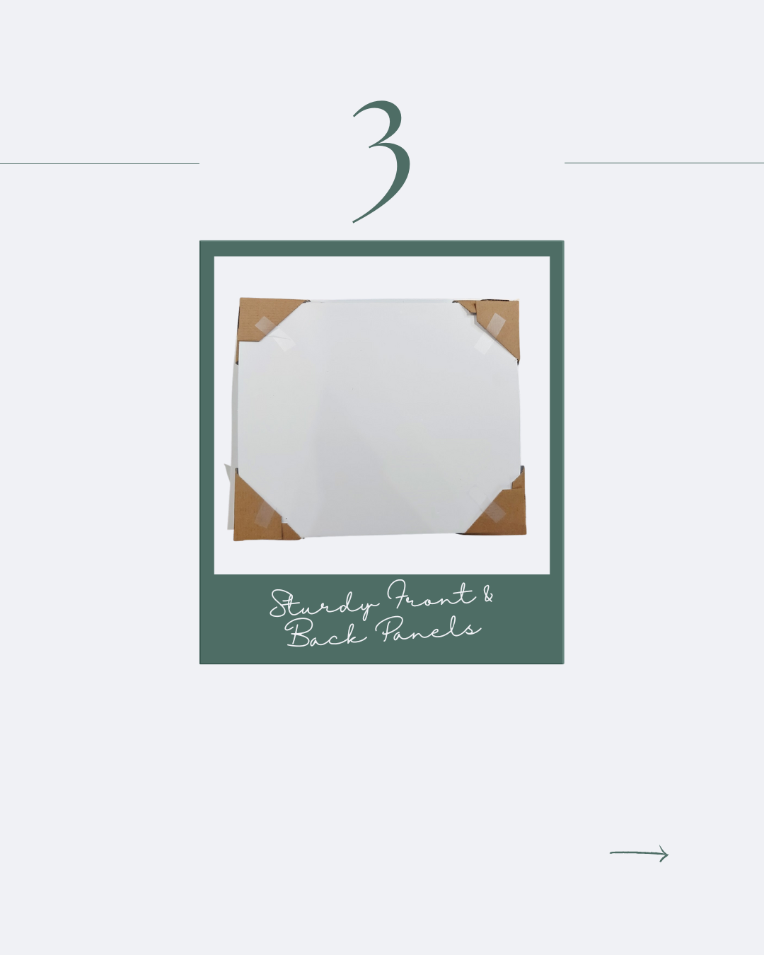 To prevent punctures or pressure damage, I secure protective boards to the front and back of the piece. Depending on the painting size, I use foam core board or corrugated cardboard.